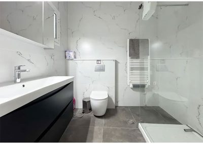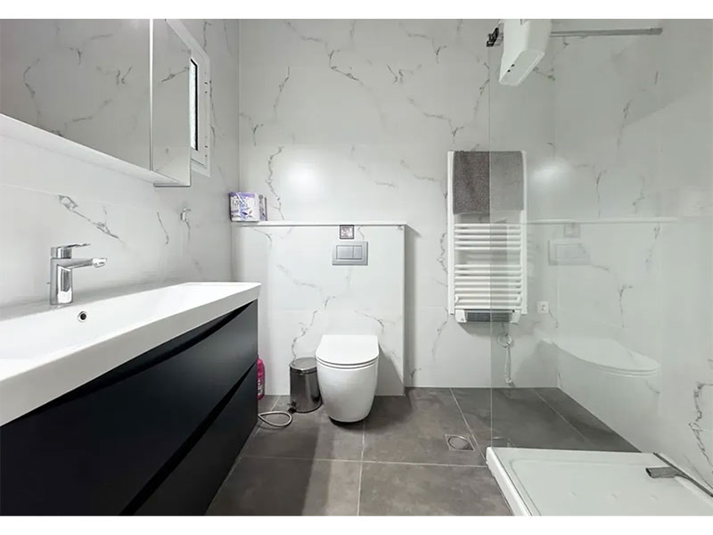 • 1 Μπάνιο: Πολυτελούς αισθητικής, με εντυπωσιακά λευκά πλακάκια τύπου Carrara, μοντέρνο νιπτήρα/έπιπλο μπάνιου, εντοιχισμένο καζανάκι και ξεχωριστό χώρο ντουζιέρας με κρυστάλλινη καμπίνα και θερμαινόμενη πετσετοκρεμάστρα.