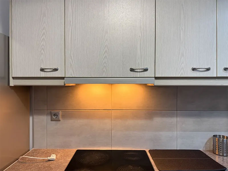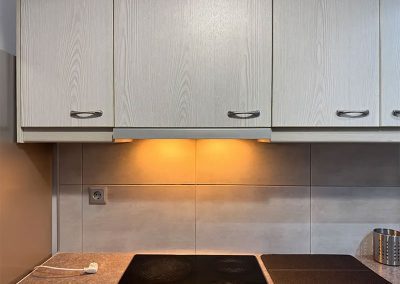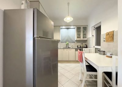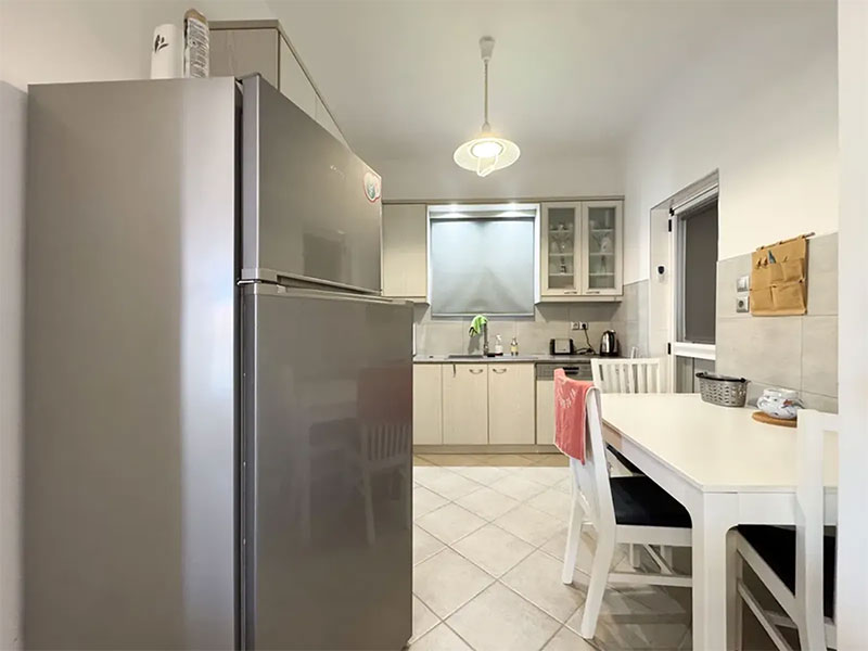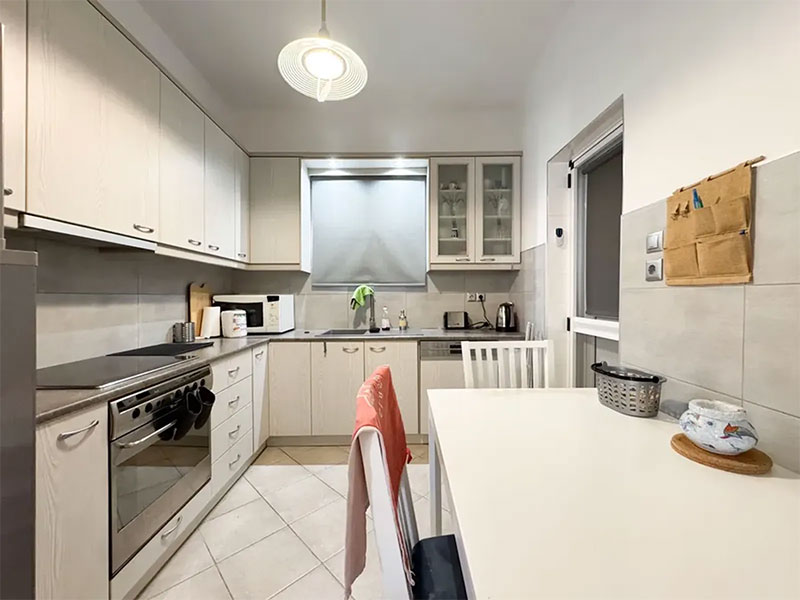 • 1 Κουζίνα: Πλήρως λειτουργική σε ουδέτερους τόνους (μπεζ/ανοιχτόχρωμο ξύλο), εξοπλισμένη με όλα τα απαραίτητα (εντοιχισμένη κουζίνα, ψυγείο, φούρνος, μικροκυμάτων) και χώρο για τραπεζαρία.